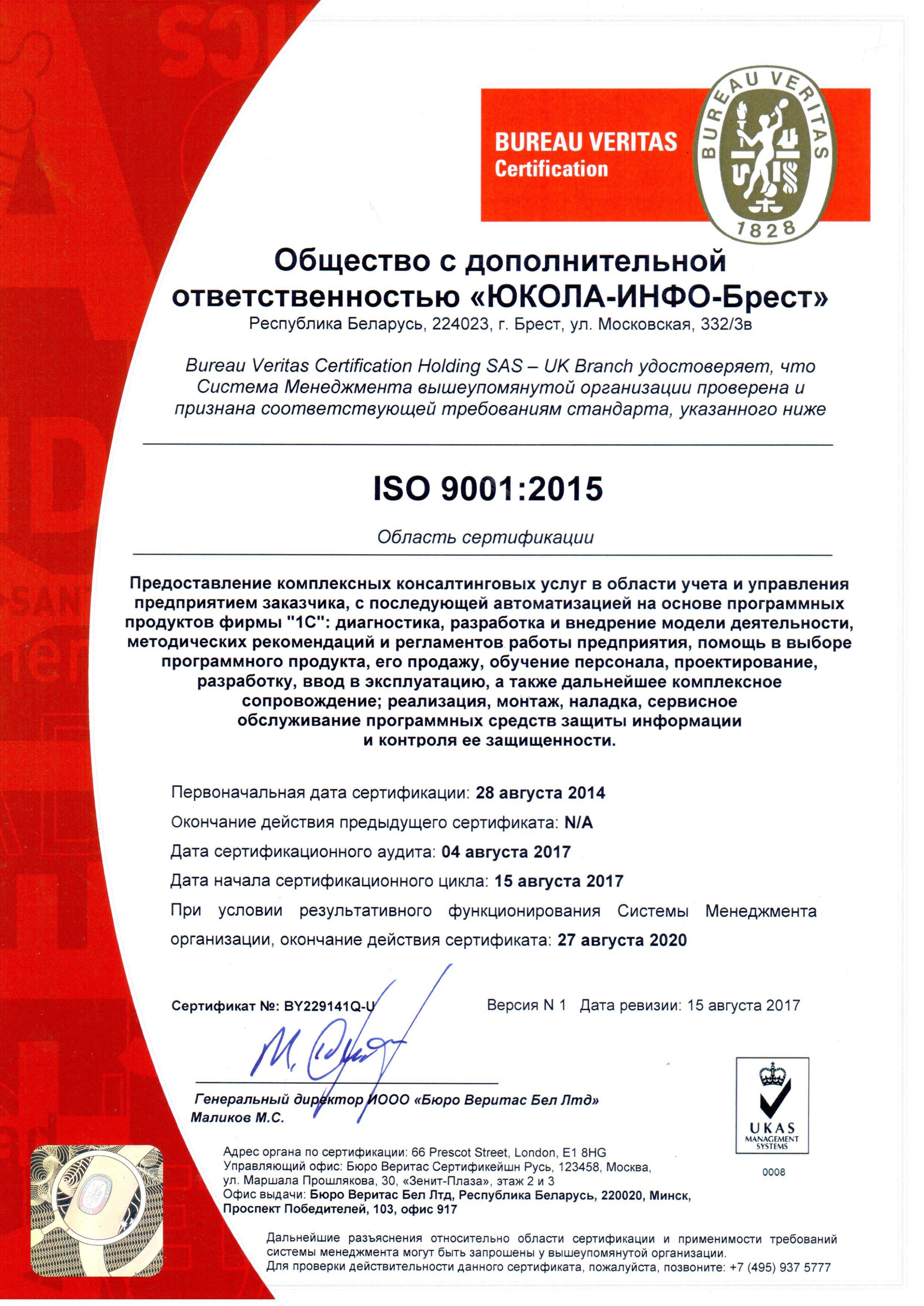 Первоначальная сертификация проводилась в 2014 году в соответствии с требованиями актуального на тот момент стандарта ISO 9001:2008. Сертифицирующим органом Bureau Veritas ежегодно проводится надзорный аудит системы менеджмента качества. По истечении трех лет с момента первоначальной сертификации система менеджмента качества подлежит ресертификации. Ресертификация подтвердила соответствие внедренной в ОДО «ЮКОЛА-ИНФО-Брест» СМК требованиям обновленного стандарта ISO 9001:2015.
